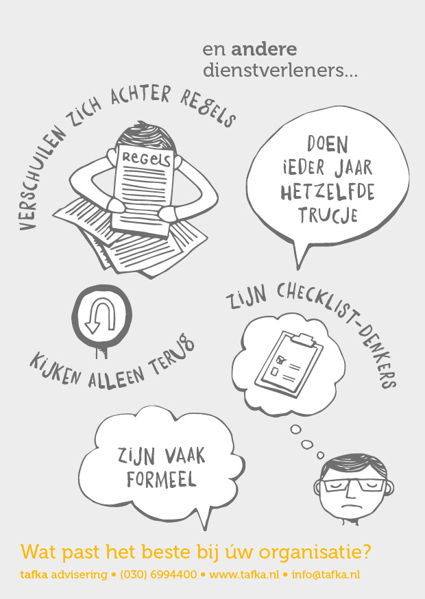 This card was made to show the differences between the colourful, flexible people of Tafka (tax advisors) and their not so exciting competitors. Co-created with Alies Design.