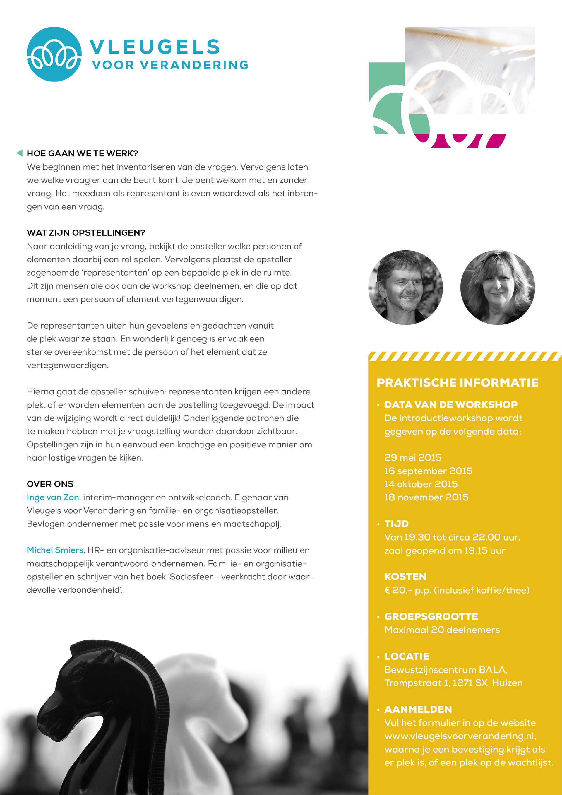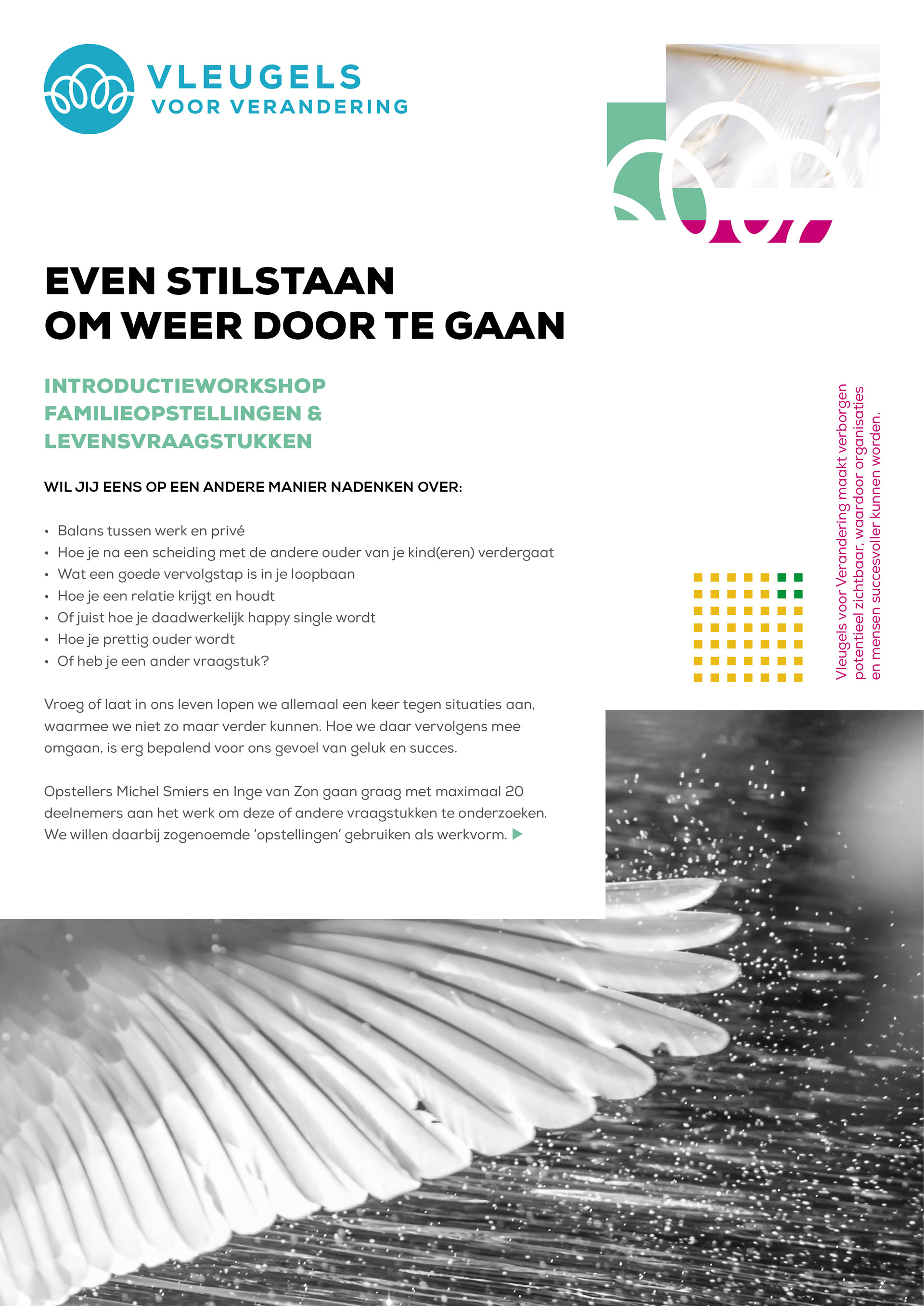 Flyer for 'Vleugels voor Verandering' (literal translation 'Wings for Change') for family constellations workshop.